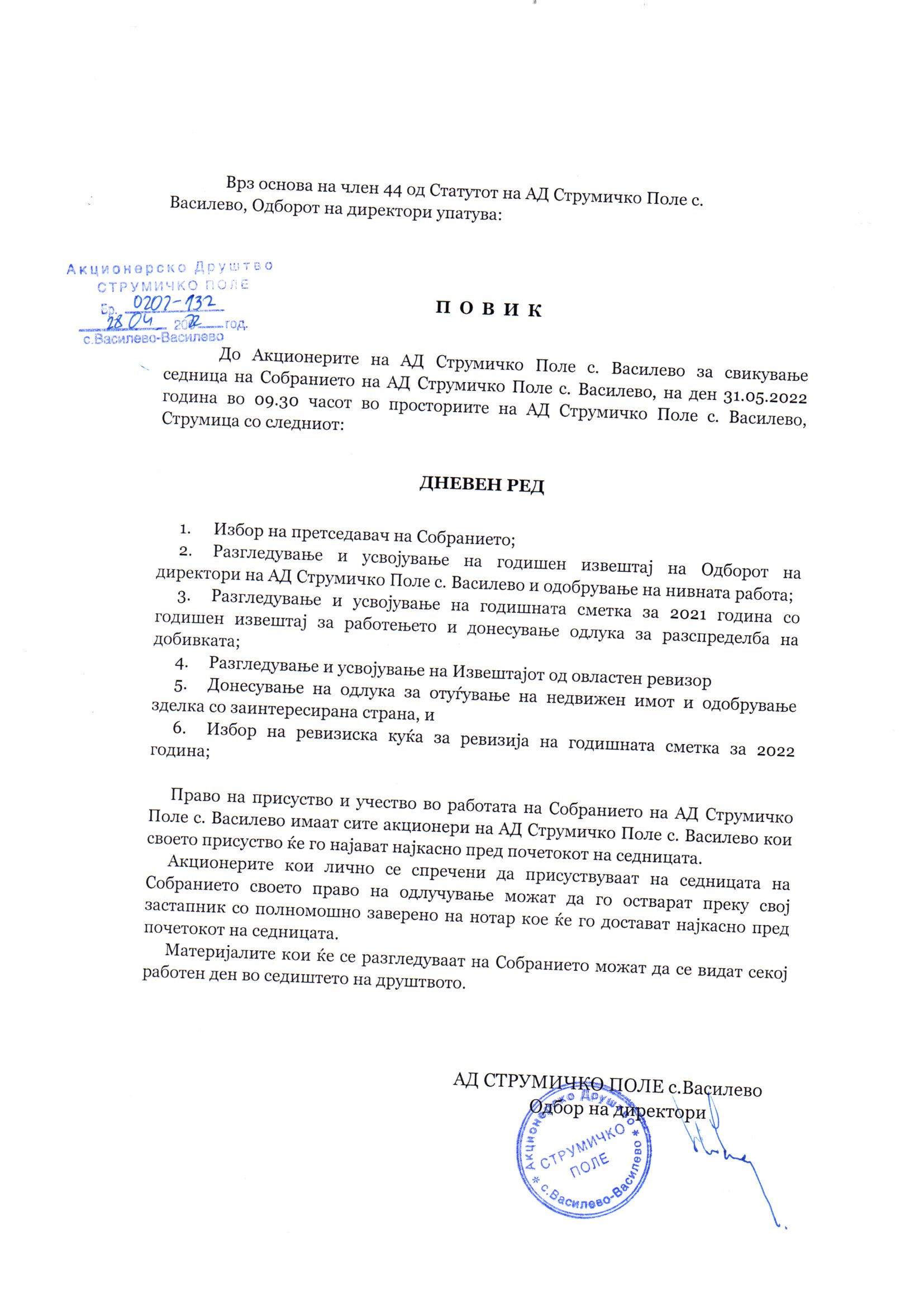 * ПОВИК ЗА ГОДИШНО СОБРАНИЕ НА ДРУШТВОТО